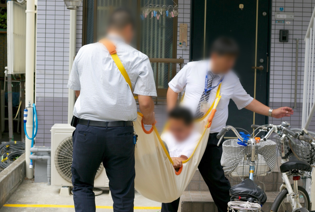 急な階段や、狭い場所など、布担架を使って患者様をベットまで移送いたします。
