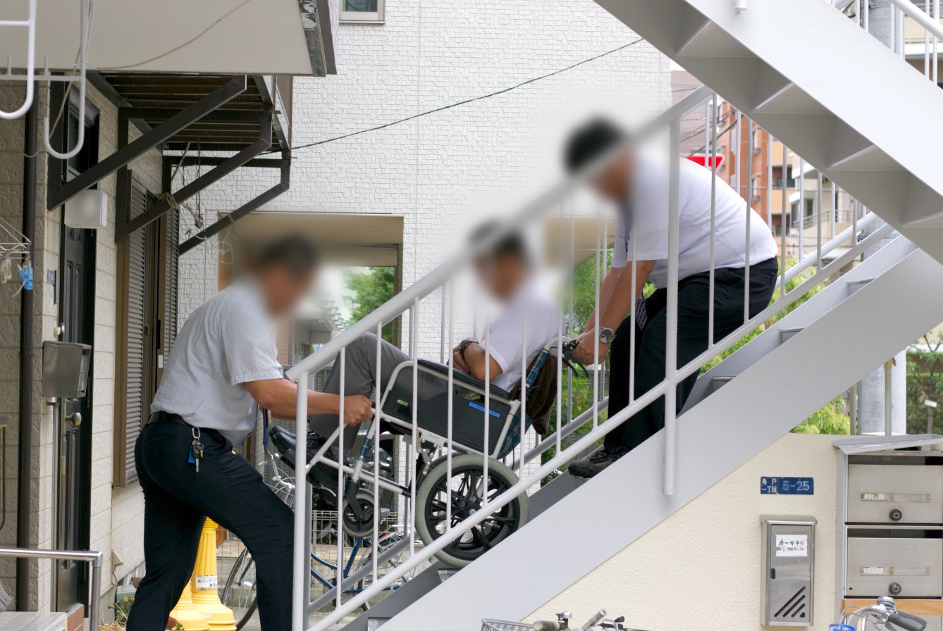 玄関や、エントランスに階段がある場合など、車椅子で階段を登る事が可能です。この場合、スタッフは1名で対応できるよう、訓練されており、介助料金のご負担も少なくすみます。